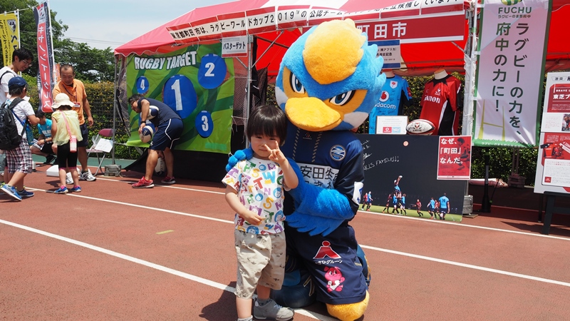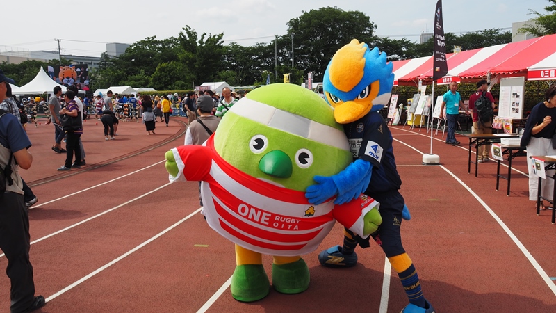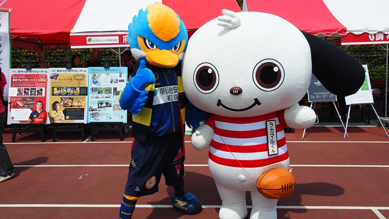 府中市のブースに来ていた『ラガマルくん』と大分県のブースに来ていた『めじろん』とコラボレーションしました。