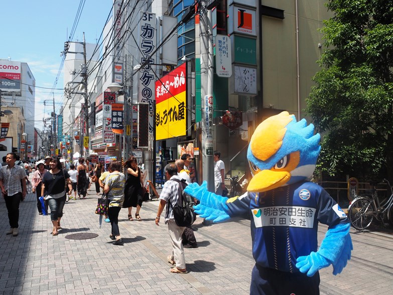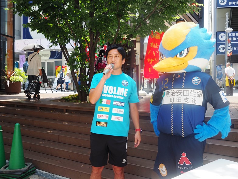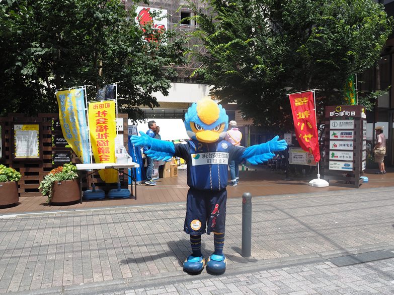 ゼルビーは主催者の方や参加者の方とふれあいながらイベントを盛り上げ、ぽっぽ町田のすぐ前の通りに出て呼び込みも行いました。