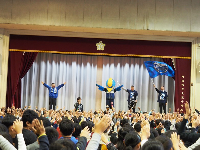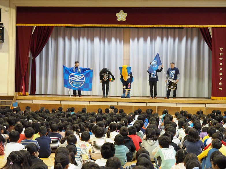ゼルビーと星大輔ホームタウン担当が16日(月)、町田市立大蔵小学校で『ゼルビア朝礼』を行いました。