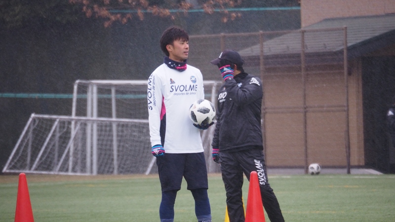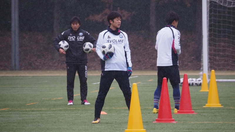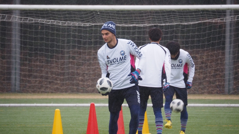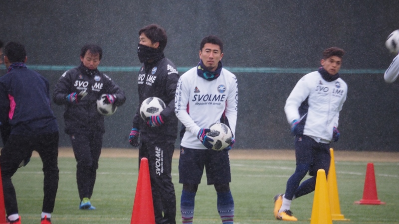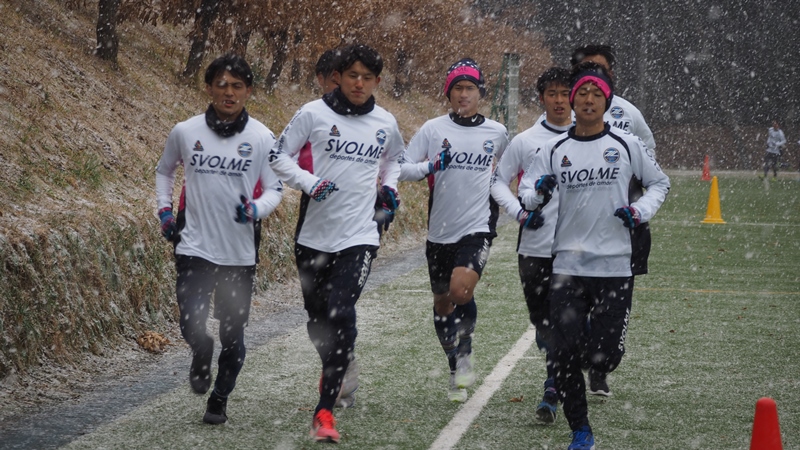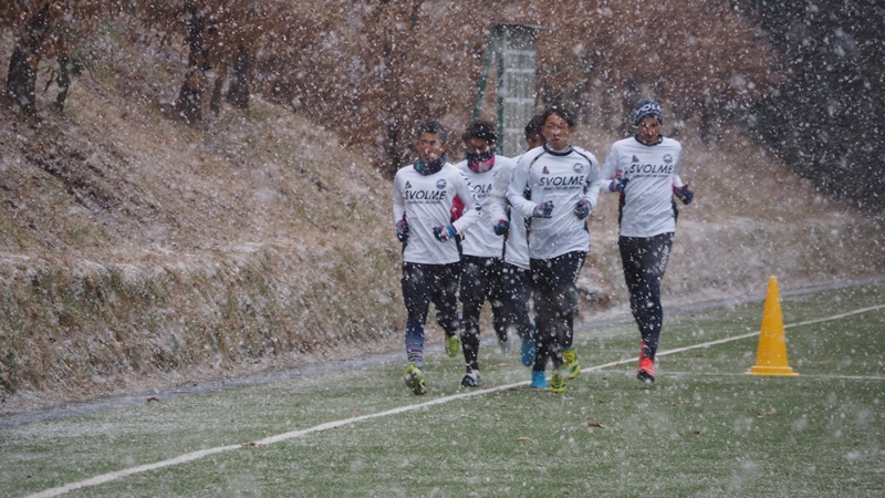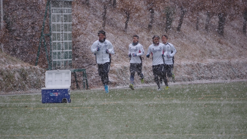 選手たちはボールを使ったメニューとフィジカルメニューを中心にこなしました。最後のメニューを消化する頃にはあられは大粒の雪に変わり、グラウンドは一面雪景色に。そんな中でしたが、元気にフルメニューを消化しました。