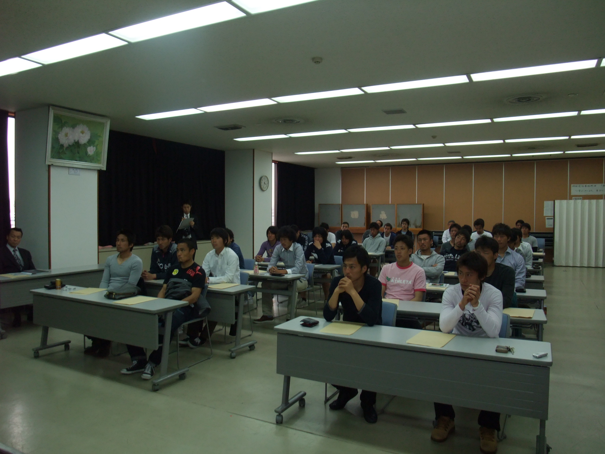 枝広基司副署長にも御出席いただき、選手たちに訓示を頂いたあと、DVD映像を見ながら「暴力団を“恐れない” “金を出さない” “利用しない” “交際しない”」といった東京都暴力団排除条例の基本理念などをビデオで学び、その後、組織犯罪対策課の竹之下一郎課長らの講義を受けました。竹之下課長は「有名になると近づいてくるヤクザがいる。食事やゴルフなどで近づいてくるが、結局はお金をむしり取るのが目的です。みなさんは地域の、子供達の誇りです。夢を壊すような行動はしないようにしましょう」などと熱く説いて頂きました。