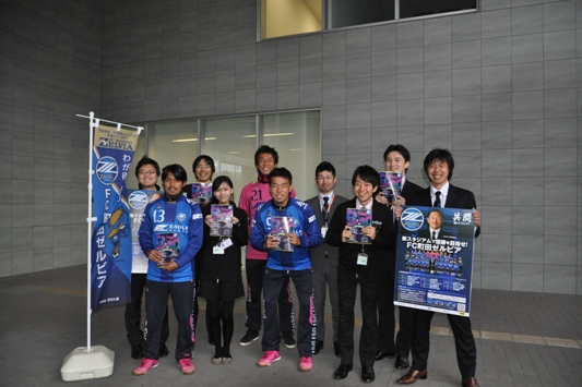 仕事帰りの市役所職員の皆さんにチラシを配りながらホームゲームへの来場を呼び掛けました。