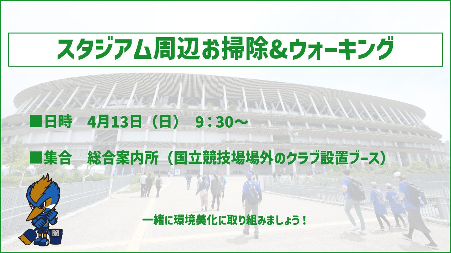 FC町田ゼルビアでは、4月13日(日)に国立競技場にて開催される浦和レッズ戦にて、スタジアム周辺の清掃活動を実施します。
