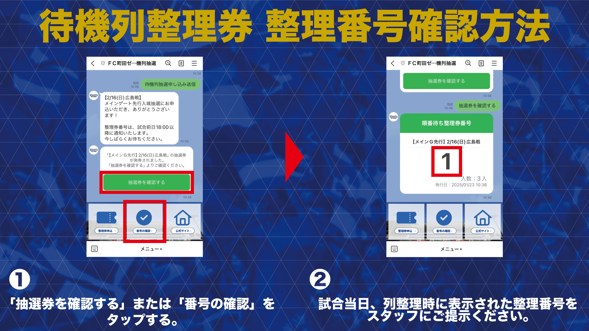試合前日の18:00以降に「待機列整理券」がLINEに届きますので、トーク画面下の「抽選確認」をタップしてご確認ください。