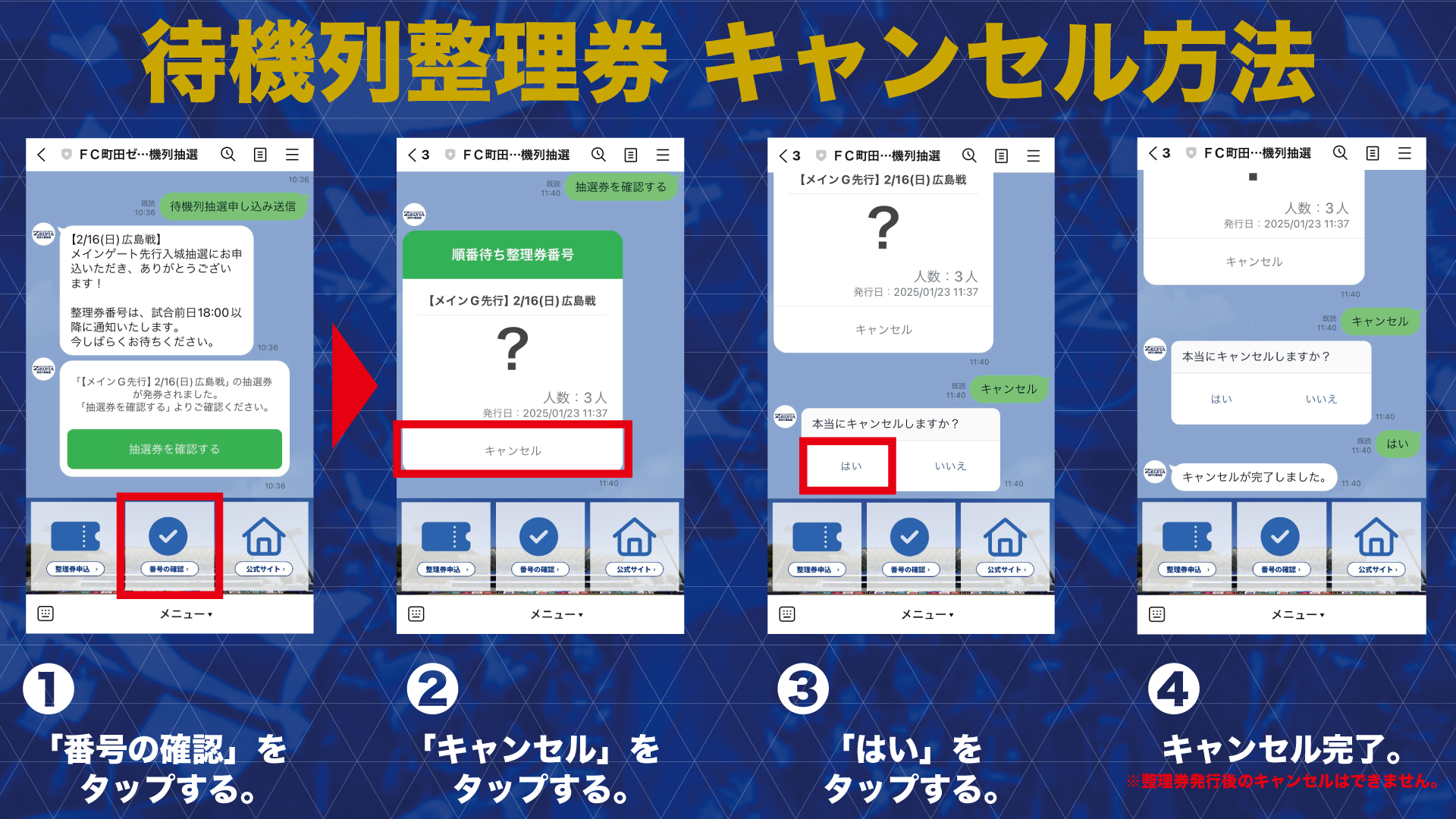 「友達追加」「FC町田ゼルビア 待機列抽選」LINEのトーク画面よりご利用可能です。