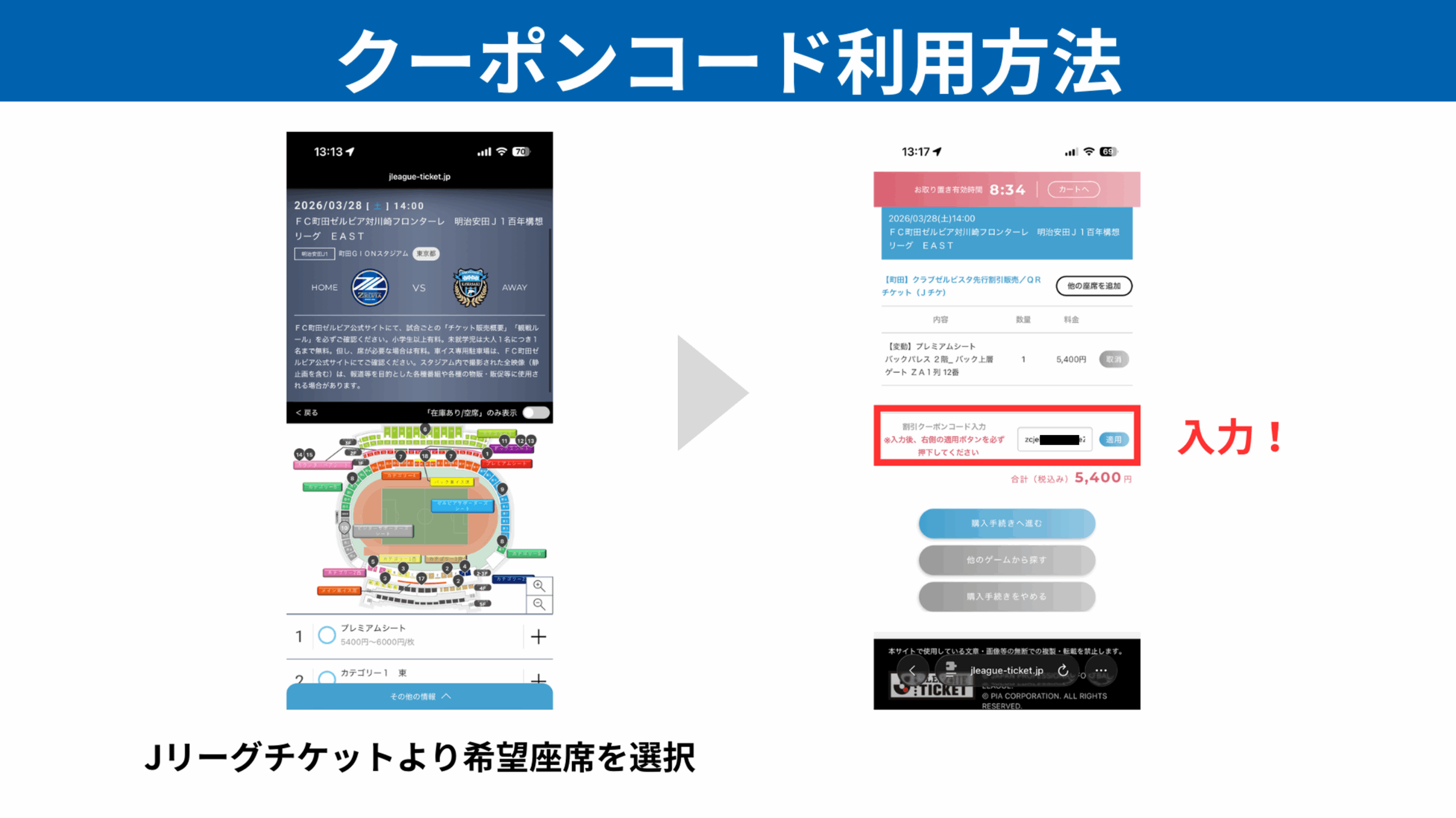 Jリーグチケットより希望試合・席種を選択し、購入画面へお進みください。