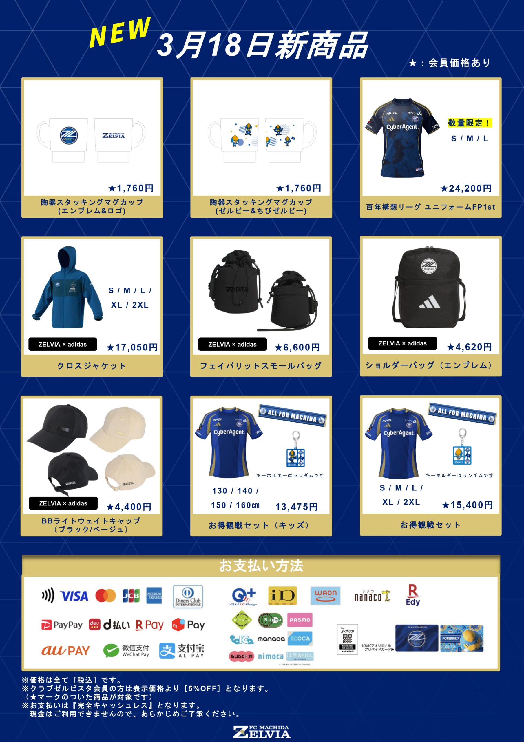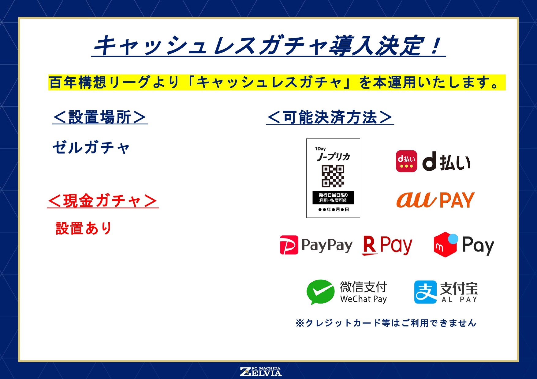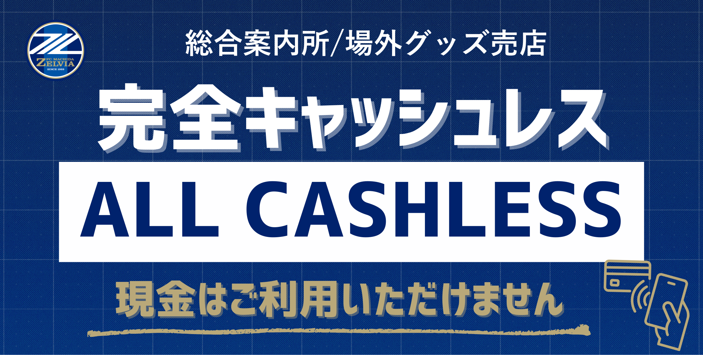 FC町田ゼルビアのホームゲーム(国立開催試合含む)では、総合案内所/場外グッズ売店のお支払いにおきまして、キャッシュレス決済のみのご利用とさせていただきます。