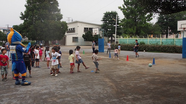 その後は、ボールを使って体を動かしました。コーンに当てるキック練習やドリブル練習を行いました。星ホームタウン担当が子どもたちに上手にボールを蹴ったり、ドリブルするためのアドバイスをしていました。そのアドバイスを真剣に聞く子どもたちの姿は印象的でした。