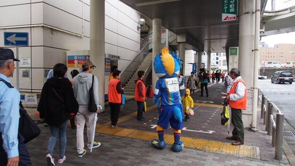 ゼルビーはグループの先導をし、ポイ捨てや路上喫煙の注意書きが印字されたティッシュとウエットティッシュを歩行者の方々にお配りしました。