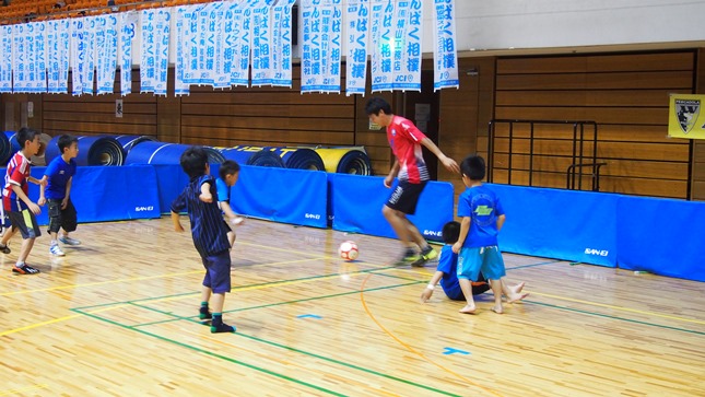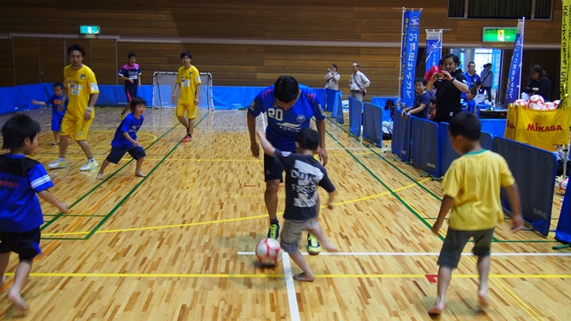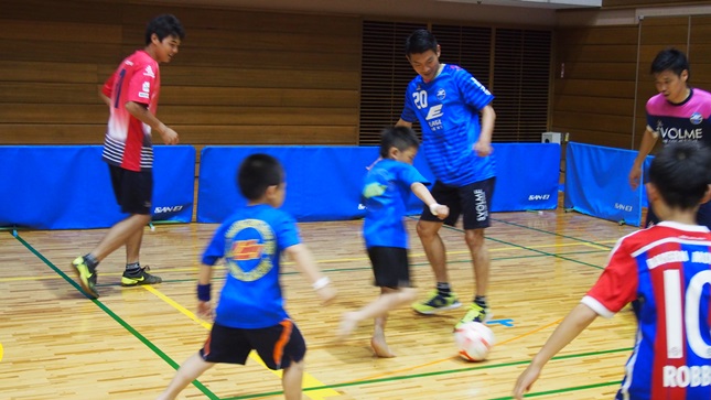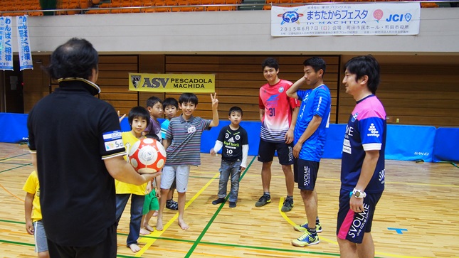 午後の時間には松下選手と千葉選手とASVペスカドーラ町田の後呂康人選手と新倉康明選手と共に子どもたちとミニゲーム対決を行いました。