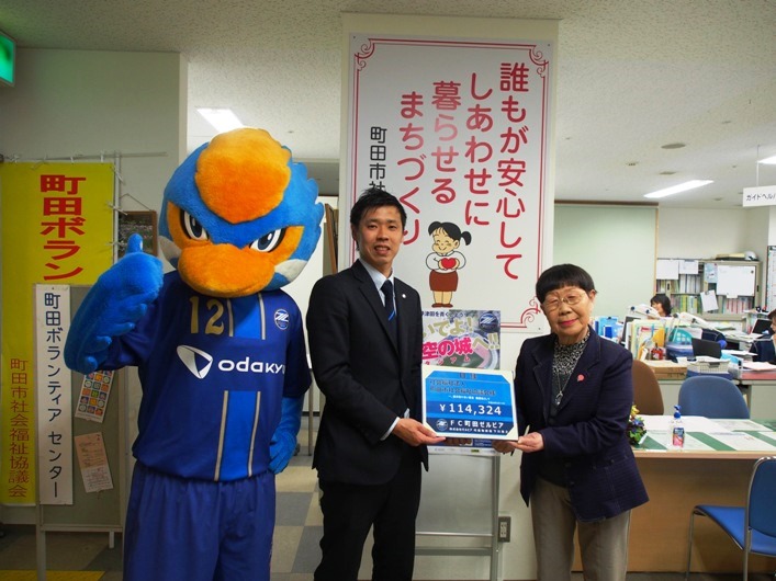 『まちだシルクメロンキャンディー』の売り上げの一部として集まった「3,000円」、そして『歳末助け合い募金』として頂いた「114,324円」を10日(木)、FC町田ゼルビア後援会名誉会員のゼルビーと、株式会社ゼルビア齋藤貴之営業兼ホームタウン推進担当が社会福祉法人町田市社会福祉協議会を訪問し、佐々木のり会長へお渡しさせていただきました。