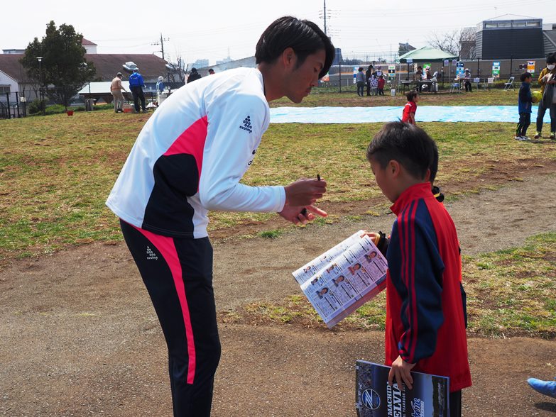 最後に選手から参加賞を渡し「試合見に行くね!」と子どもたちから言葉をもらいました。