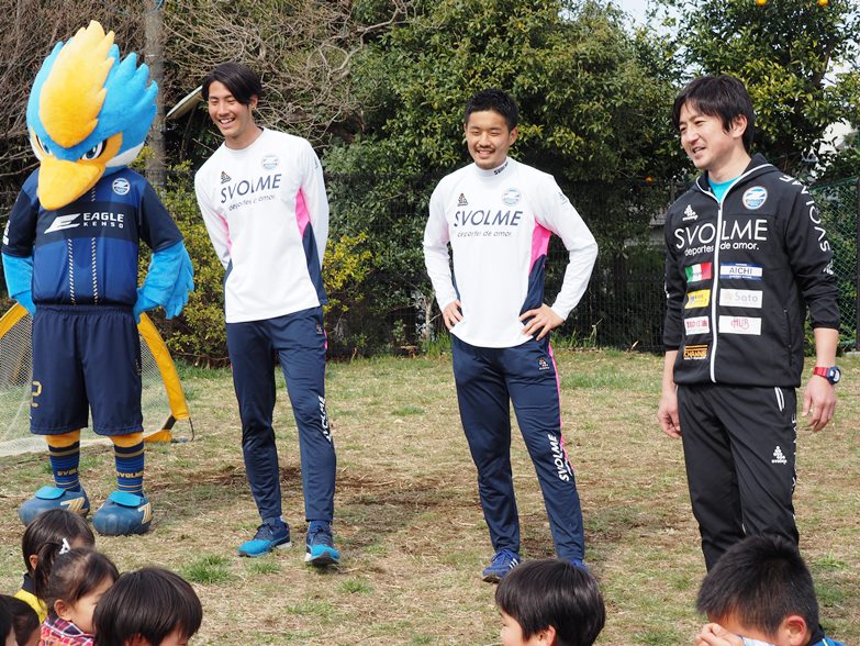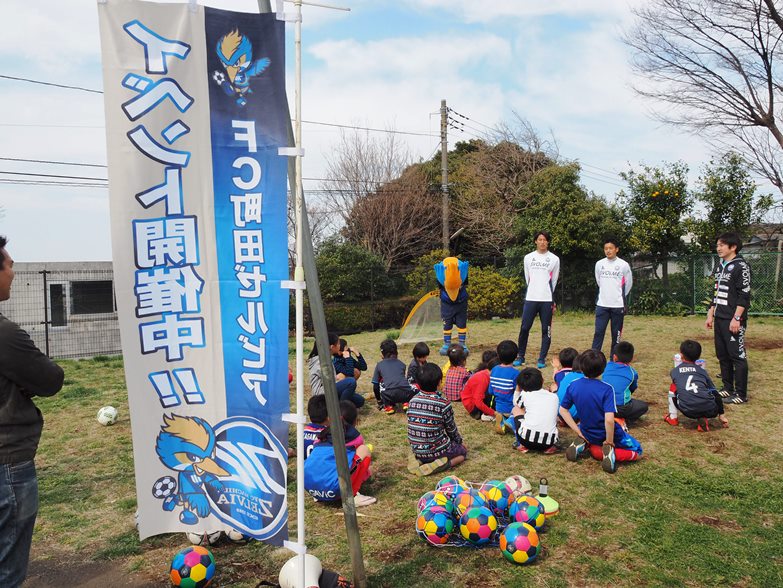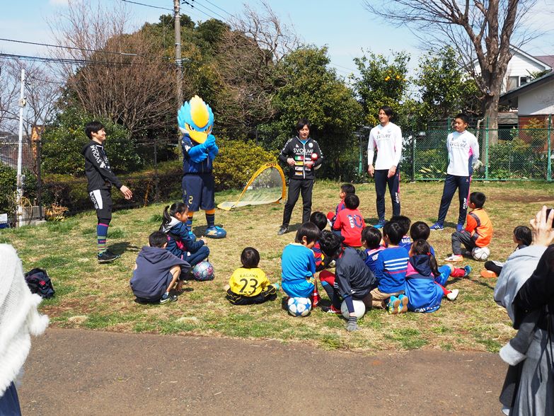 トップチームの松本怜大選手と戸島章選手、ゼルビーと星大輔ホームタウン担当が2日(日)、『玉川学園さくらめぐり第6回はなびら市』に参加し、3丁目子供広場でサッカー教室を行いました。
