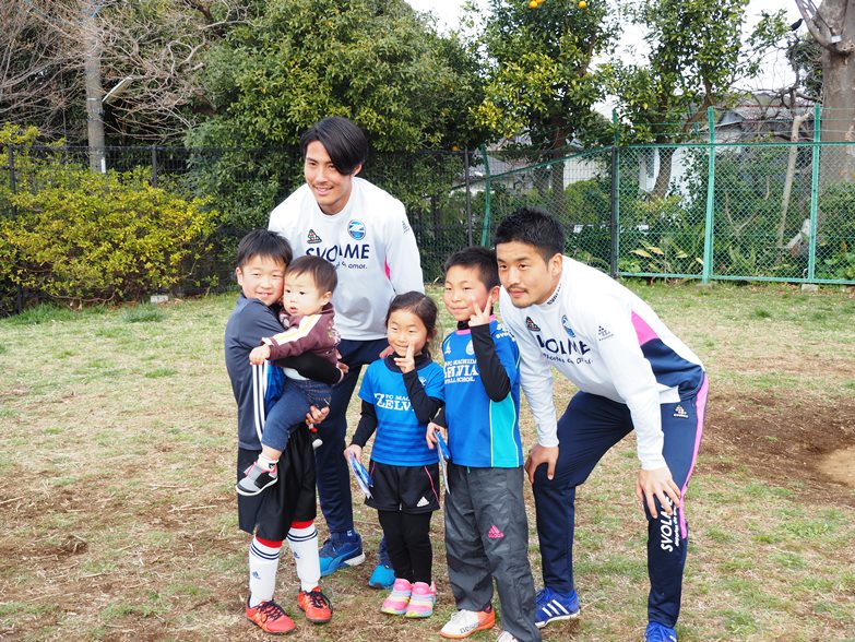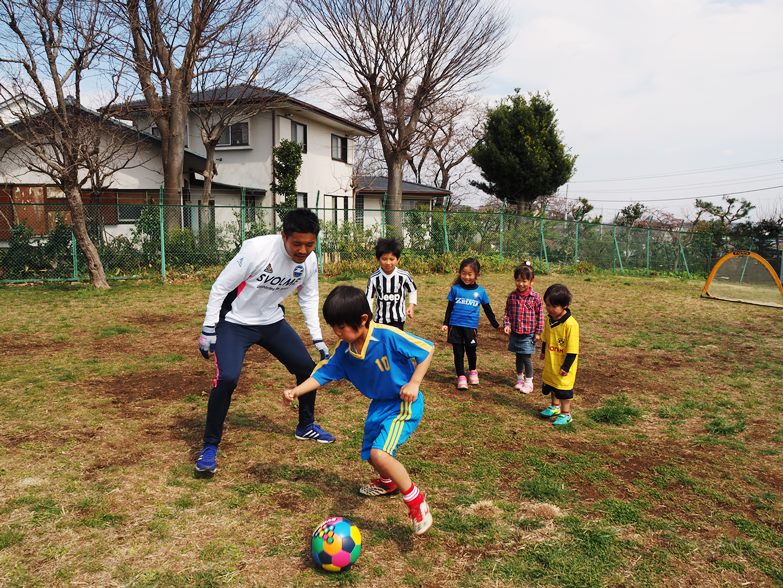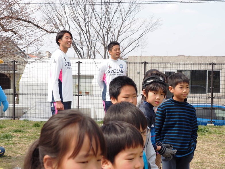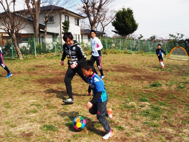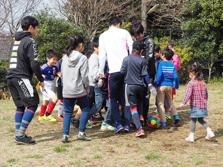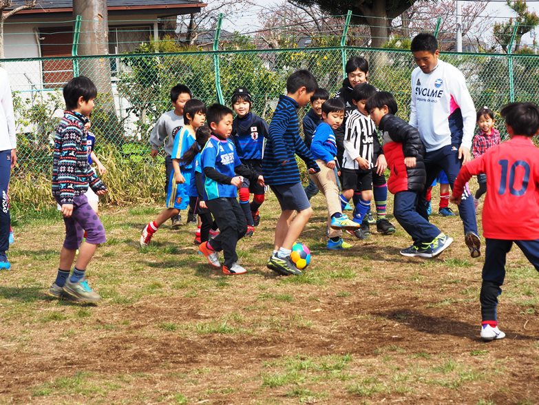 選手からの挨拶、星コーチ、山川コーチの紹介から始まり、コーチを追いかけてウォーミングアップをしたあとは、ゼルビアチーム対子どもたちチームに分かれて試合を行い、初心者の子どもたちも楽しそうに頑張ってボールを追いかけていました。